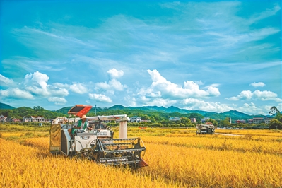 7月,增城區中新鎮濠逕村迎來豐收,農民正在收割稻谷