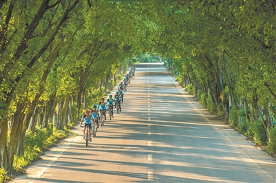 在環境優美的白云區米崗村里,一支自行車隊從林蔭路上經過