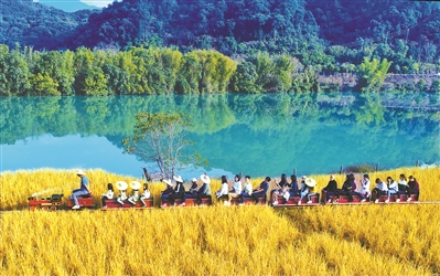 在從化區米埗小鎮里,游客乘坐小火車穿過金色稻田,旁邊是碧綠色的流溪河