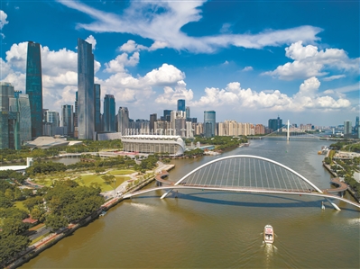 近日,廣州藍(lán)天白云相伴,大橋長(zhǎng)虹臥波,倒映交融于珠江。