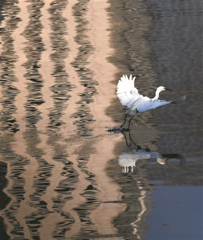 白鷺享受陽(yáng)光,在珠水中留下倩影。