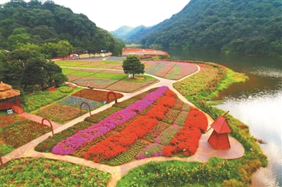 在石門國家森林公園,海拔約800米的天池湖畔,花海綿延。16000平方米花田上用千日紅、千日粉、雞冠花,醉蝶花、孔雀草、鼠尾草等花卉布置成花海。主景部分設計為“石門國家森林公園標識”的形象,寓意石門風光無限好。
