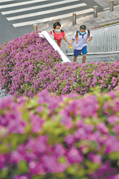 員村四橫路附近的人行天橋上,簕杜鵑燦然盛放。
