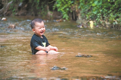 大源村的一位小朋友在清澈的沙坑涌里愉快戲水。