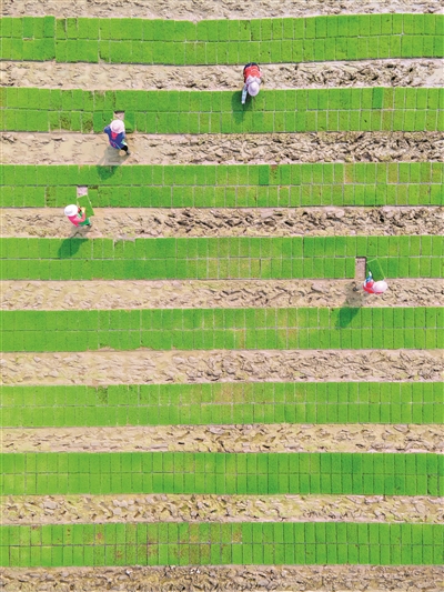 從化區鰲頭鎮中塘村生態優質絲苗米產業園內,工作人員將秧盤擺放整齊