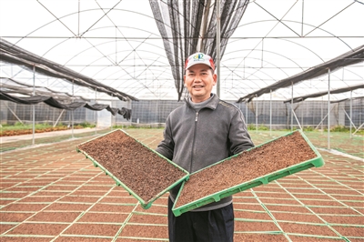 增城朱村街,農人將育秧盤搬至溫暖的大棚內