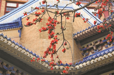 另外,“木棉王”周邊是全園木棉樹冠覆蓋最密集的區域,每到木棉盛開的季節,“幾樹半天紅似染”就是對這個區域最形象的表述。由于該區域離中山紀念堂主體建筑距離最近,藍瓦、黃墻、紅花、隔窗、飄檐、懸枝,還有灑落的陽光和偶爾駐足的小鳥,這些畫面隨便組合都是大片的元素。這其中以位于主體建筑旁邊的木棉最“搶鏡”。這株木棉胸圍約3米,樹齡58歲,是古樹后續資源之一,它因其獨特的低矮垂枝造型,和古建筑的元素距離得宜,兩者交相輝映,常常受到各種鏡頭的青睞,不僅如此,每年在中山紀念堂盛開的第一朵木棉花都由它擔當,真是名副其實的“報春使”。