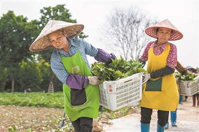 保供綠 4月11日,花都區(qū)東海菜場,工人將新鮮采摘的番薯葉裝筐,準(zhǔn)備運(yùn)往江南市場。