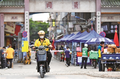 速度黃 4月13日,42歲的美團(tuán)騎手何擁綱完成配送服務(wù)后,駛離番禺區(qū)員崗管控區(qū)。
