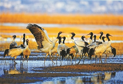 草海是中國三大高原湖泊(草海、滇池、青海湖)之一,也是貴州省最大的高原天然淡水湖泊,國家級自然保護區。它位于威寧縣縣城西南面,水域面積46.5平方公里,相當于8個西湖那么大。高山、淡水、湖泊再加上充足的日照,讓草海成為候鳥越冬的最佳目的地。草海作為180余種計20萬只鳥類的重要越冬地和遷徙中轉站,還是我國特有的高原鶴類——黑頸鶴的主要越冬地之一。