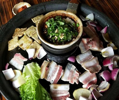 用本地燒制的土砂鍋,加煤火,食客圍坐于烙鍋前,將蔬菜、肉類、河鮮等放在鍋上邊烙邊吃,烙鍋升溫,鍋上的美食隨著“滋滋”的烙燒聲逐漸透露出香氣。