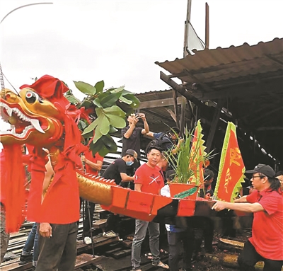 “加油!加油!”在指揮的奮力吆喝和“咚咚”的鼓點聲中,一條長度接近40米,龍頭艷麗、全身烏黑的傳統龍舟,在村民齊心協力推動下,緩緩滑入水中。