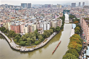 這時,鼓手擂響了龍舟鼓,龍舟劃手有節奏地齊齊劃槳,伴隨著岸上陣陣鞭炮聲和龍舟上陣陣鼓點,插滿祈求風調雨順錦旗羅傘的新“東坡號”,在兩岸村民的注目下,開始了在車陂涌的首次巡游。烏黑的船身劈開清澈的水流,與岸邊各色花卉、蜿蜒的碧道相映成趣,從空中俯瞰,一幅嶺南水鄉風情畫在眼前徐徐展開。