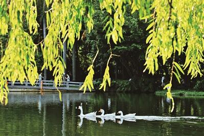 秋日的海珠濕地,市民劃著槳板泛舟湖上