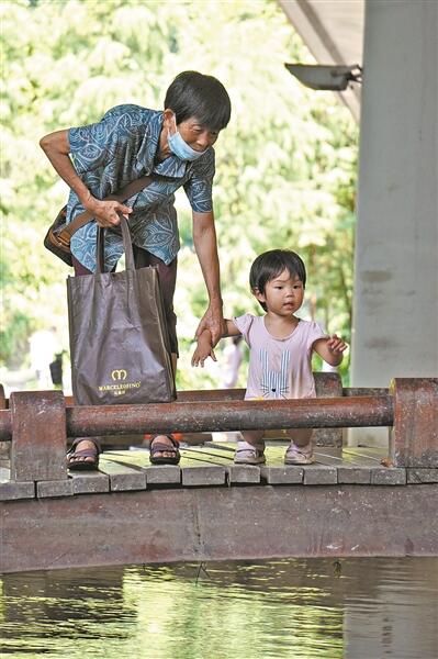 東濠涌親水平臺,老人帶著小孩在橋上看魚