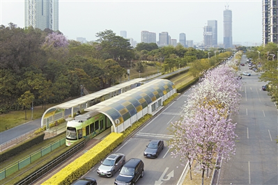 有軌電車駛過(guò)開滿宮粉紫荊的琶洲塔站。