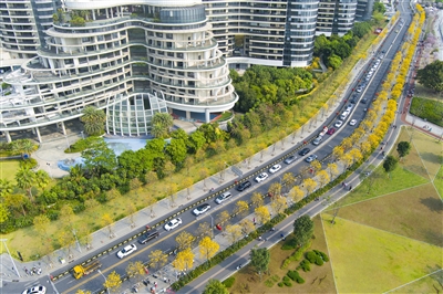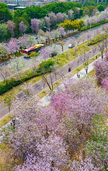 粉黛賞遍,還不能忘記那與春天最為適配的嫩黃色。洲頭咀公園旁的環(huán)島路,黃花風(fēng)鈴木已攀上枝頭、串串搖曳,惹得路人紛紛駐足,掏出手機(jī)拍個(gè)不停。這里是廣州有名的“網(wǎng)紅”景點(diǎn),不少市民成群結(jié)隊(duì),專門來(lái)打卡這枝頭的“黃精靈”,還有不少扛著專業(yè)設(shè)備的攝影愛(ài)好者,趕來(lái)為這滿園春色留下紀(jì)念。