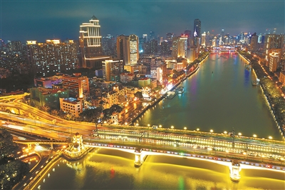 在漫長歲月中,一座座跨江大橋與珠江融成一體。2009年,珠江兩岸(白鵝潭至琶洲大橋段)進行了景觀照明的統一規劃和建設,此后又不斷提升。每當華燈初上,從人民橋到琶洲大橋,珠江已經形成一條燈光廊道,成為廣州夜晚最美的景觀。每一座橋上,都流連著沉醉于燈光的人們;而橋下,每每游船經過,總有人喊“橋上的朋友你們好”。