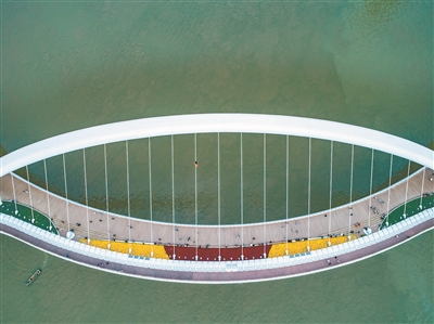 古琴弦動,舞粵曲水袖;珠水蕩漾,映嶺南花舟。中國工程院院士、華南理工大學建筑設計研究院首席總建筑師何鏡堂說,這座人行橋的設計主線便以“琴鳴絹舞、嶺南花舟”為理念——橋面提取粵曲水袖的形態特征,再現粵曲神韻;橋拱融入嶺南古琴的造型元素,橋上的拉索就好像古琴上的琴弦;橋面景觀以嶺南花舟為主題,花開滿橋。同時,結合“人行”這一獨特功能,海心橋還以曲線形態融入兩岸現有步行系統,游客在橋面行走時步移景異,如在畫中行走;橋拱如眼,形成了朝向珠江核心景區的最佳環視觀景面,而人行橋輕盈通透的姿態也在江上形成了一道最美的曲線。