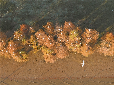 1月3日,黃埔區大吉沙島,層林盡染的落雨杉和蹁躚起舞白鷺群形成了一幅美麗的畫卷。