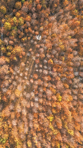 1月7日,麓湖公園的落羽杉已悉數換裝,吸引了不少市民游客前去觀賞。