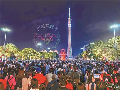 2月12日晚,花城廣場(chǎng)舉行無人機(jī)表演,市民游客共享視聽盛宴。數(shù)字技術(shù)與新春文旅活動(dòng)跨界融合,讓來自五湖四海的游客享受到科技感滿滿的“廣州年”。