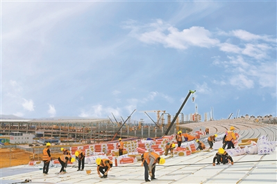 春節(jié)期間,白云機(jī)場(chǎng)T3航站樓建設(shè)現(xiàn)場(chǎng)“熱度”和“速度”絲毫不減,春節(jié)留守的工人在屋面上施工。