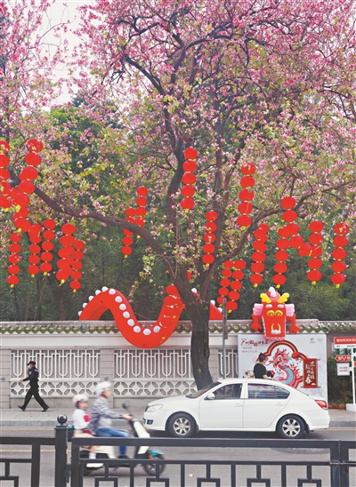 廣州街頭的紫荊花與紅燈籠搭配出新年的喜慶氣氛。