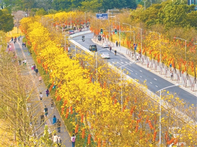 海珠區(qū)環(huán)島路黃花風(fēng)鈴木初開(kāi),街道兩旁染上浪漫的金黃色。