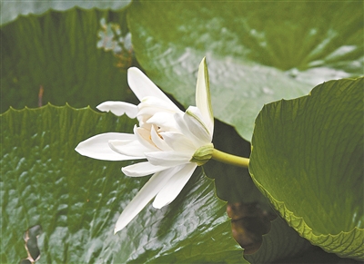 曉港公園,碧綠的池塘里,白色的蓮花悄然綻放。