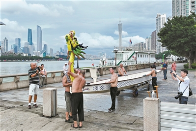 6月14日,濱江東路游艇會碼頭,工人們將龍頭安裝在龍舟之上,為即將到來的廣州國際龍舟邀請賽做精心準(zhǔn)備。