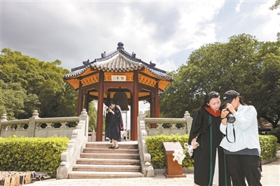 6月23日,中山大學(xué),畢業(yè)生和家人在陽光下拍攝畢業(yè)照。