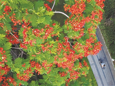 五月的廣州是鳳凰花的天下。據(jù)不完全統(tǒng)計(jì), 全市共有鳳凰木2.5萬(wàn)余株,比較集中之處在白云大道、廣州大道南等地。