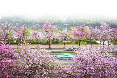 從二月底或三月初開(kāi)始,人民北路看紫荊,千樹(shù)萬(wàn)樹(shù)繁花開(kāi)。有市民說(shuō),每到花季,從人民北路走過(guò), 感覺(jué)自己都成了風(fēng)景。