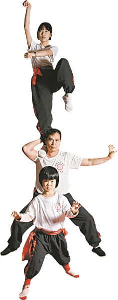 馮亦慧與他的兩個女兒在練洪拳。大女兒馮敏婧站在父親肩頭擺出靈鶴棲枝(鶴形),作猛虎推山姿勢的馮亦慧居中,小女兒馮敏瑜則擺出夜虎出林的造型。