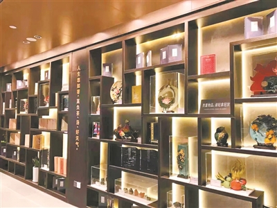 “門官廳”的一側,一道景觀樓梯,錯落層疊,瓦當紋裝飾的墻面上賦有多個廣州文化地標簡述,彰顯一派嶺南建筑氣象。店內隨處可見的“鑊耳山墻”“滿洲窗”圖案,讓人情不自禁喚起老廣州的記憶。收款臺后北京路老街道場景的銅雕主背景,打造“繁盛之所,博學殿堂,華燈璀璨,靜謐書齋”的景象。