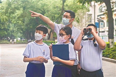 樹木繁茂,小鳥也多,沙面小學副校長劉湛泉帶領自然觀察興趣小組的學生觀鳥