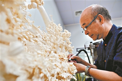 牙雕大師張民輝在創(chuàng)作骨雕作品