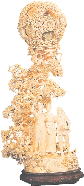 新中國成立后,國家組織集體大規(guī)模生產(chǎn)牙雕工藝品,當(dāng)時規(guī)模最大的廣州大新牙雕廠匯聚和培養(yǎng)了眾多名師巧匠,生產(chǎn)規(guī)模居全國工藝行業(yè)之冠。鎮(zhèn)廠“三寶”——象牙球、象牙船和撒網(wǎng)船,更代表了嶺南牙雕的最高技藝。牙雕成了廣州一塊響當(dāng)當(dāng)?shù)钠放疲啻巫鳛閲e級禮品,同時也為國家賺取了大量外匯。