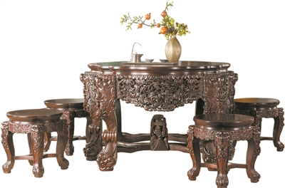 《獸頭獅腳圓臺》為陳達強的代表作之一,其四凳一桌,大紅酸枝材質。桌面攢框鑲板,面下束腰,牙板及腿足上均雕有精美的紋飾,浮雕、鏤雕和半圓雕相結合,形象生動。