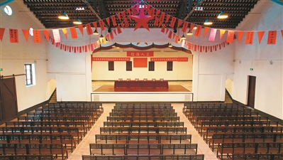 穿過“一勞大”舊址主樓一樓前廳,轉入小院,映入眼簾的是一座有著百余年歷史的禮堂,1922年5月,“一勞大”在這座禮堂開幕。為紀念“一勞大”召開100周年,這座禮堂被重新修葺,禮堂內部的大會會場布置完全參照歷史記載還原100年前的實景:主席臺中央設有工人講壇,上方懸掛標語和口號。會場正上方的紅色五星代表了工人階級團結抗爭的堅定信念,周圍懸掛的小紅旗上寫著“勞工神圣”“工作八小時”等勞動標語。