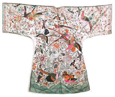 白緞地廣繡百鳥紋對襟長氅衣(廣州十三行博物館藏)