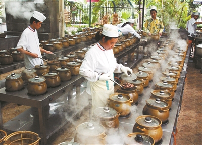 隨著歷史的腳步,廣州人對湯的喜愛愈加濃厚。南越王博物院展出的明清廣州炊具中,就有用于煲湯的帶把陶罐。南越王博物院的工作人員表示,當時,廣州人已養成了煲湯的習慣,食材也常因時令而變,春夏能清熱解毒,秋冬能補充營養,調理身體。
