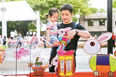 一對父女被彩燈攤位前的作品所吸引。
