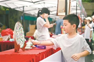 小朋友在非遺攤位上觀賞廣彩作品。