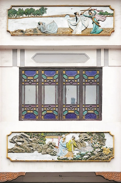 廣州第十甫路騎樓街,陶陶居酒家的墻面上除了滿洲窗,還有中國(guó)傳統(tǒng)故事的彩色浮雕