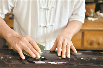 指著古琴,區(qū)君虹向記者闡述了自己總結(jié)出修復(fù)古琴的“望聞問(wèn)切”之法——首先,通過(guò)“望”來(lái)確定其大致年代、形制、材料、漆色與斷紋等方面的情況;其次,通過(guò)“聞”來(lái)了解其流傳脈絡(luò)、辨別音質(zhì)、材質(zhì)等;再次,通過(guò)“問(wèn)”來(lái)探查、尋求、了解古琴存在問(wèn)題;最后,通過(guò)“切”來(lái) 觸摸古琴的琴體,感知漆灰斷紋和龍池鳳沼內(nèi)的琴木的觸感、溫度的微妙感覺(jué),從而對(duì)其年代及狀態(tài)的判定有所幫助,綜合各方面信息制定修復(fù)古琴的方案。