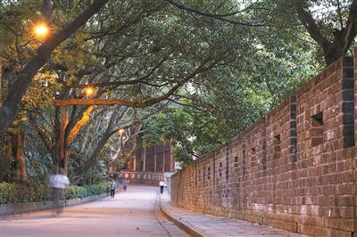 20世紀初,除鎮海樓外,明城墻只剩下高低不等的殘垣。1918年-1922年,廣州修筑馬路,這段位于越秀公園內的城墻與交通規劃無礙,因此得以保留下來。1987年7月至12月,重修鎮海樓范圍內180米古城墻,恢復明式雉堞;2012年起,全長1179米的明代廣州古城墻(越秀山段)實現邊修復邊開放。如今,炮火與煙灰早已隨風而逝。記者沿著城墻一路走來,只見墻根下是悠然散步的市民,還有人在踢毽子、下棋、跳舞……驀然回首,那石縫中冒出嫩芽的墻垣,無聲訴說著歲月的滄桑印記。