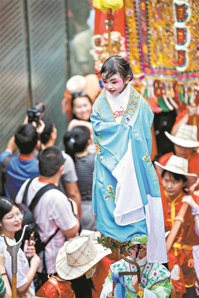 記者在現(xiàn)場(chǎng)看到,沙灣飄色巡游上的“色仔”因?yàn)檠灿螘r(shí)間較長(zhǎng),“色仔”們有的打起了瞌睡,有的嘴饞吃起了零食,有的熱得拿小風(fēng)扇直吹,還有的哭鬧起來(lái)弄花了妝,憨態(tài)可掬,引得觀眾大笑直呼:“好得意!”