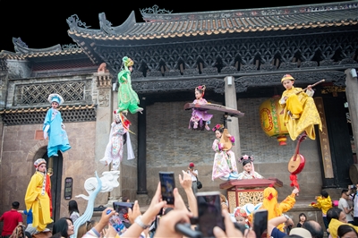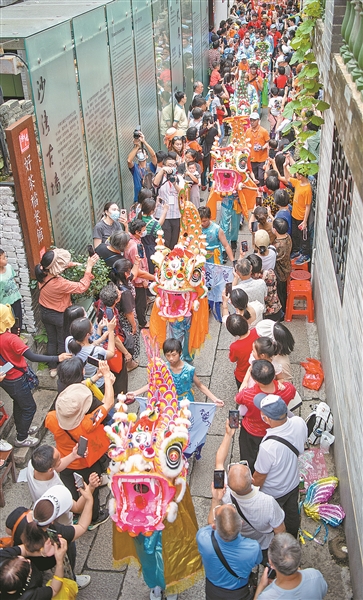 整個(gè)沙灣古鎮(zhèn)變成了歡樂(lè)的海洋,主會(huì)場(chǎng)被圍得水泄不通,更多街坊和外地游客則涌向巡游路線沿線,等待一睹嶺南飄色風(fēng)采。